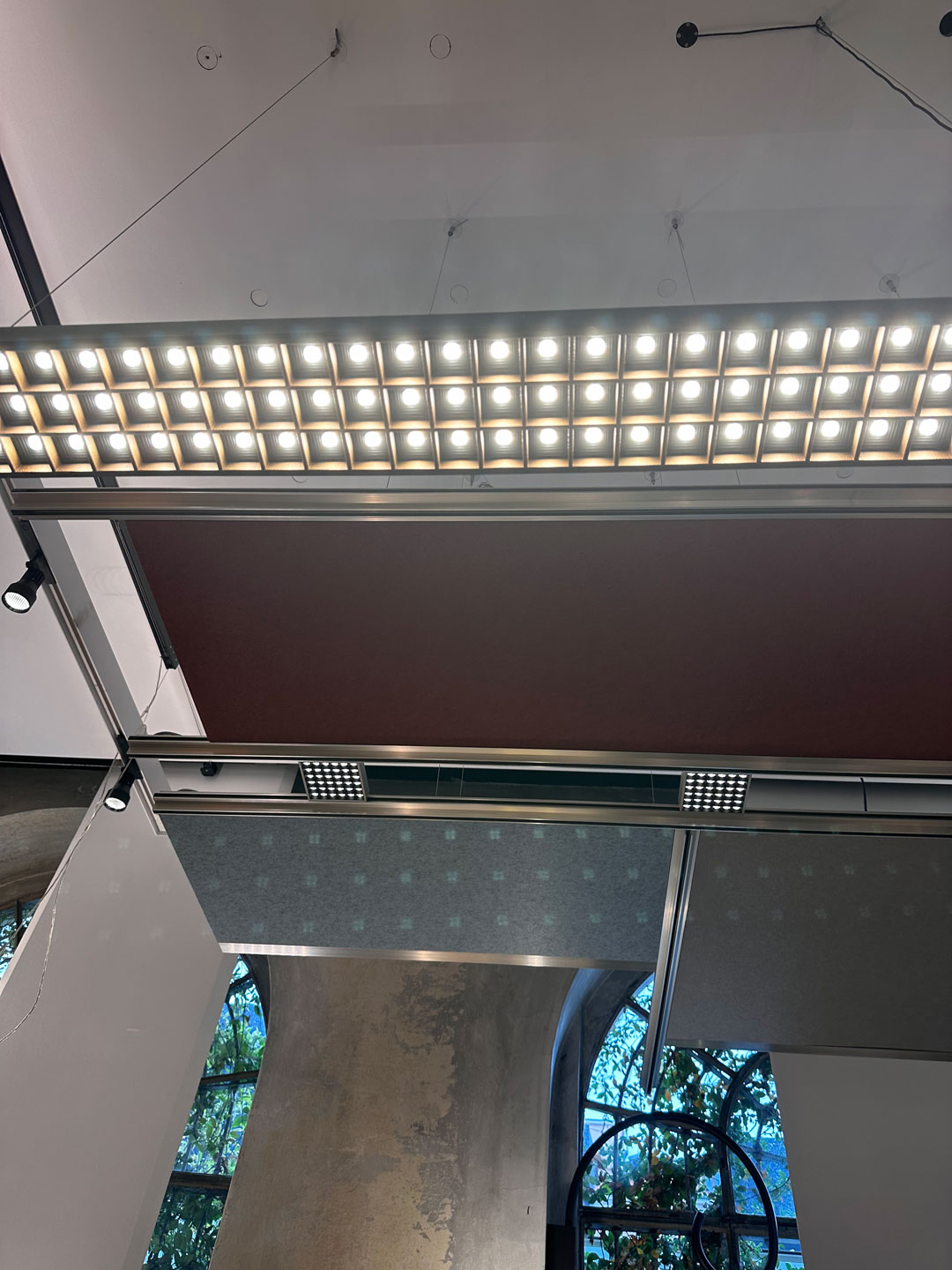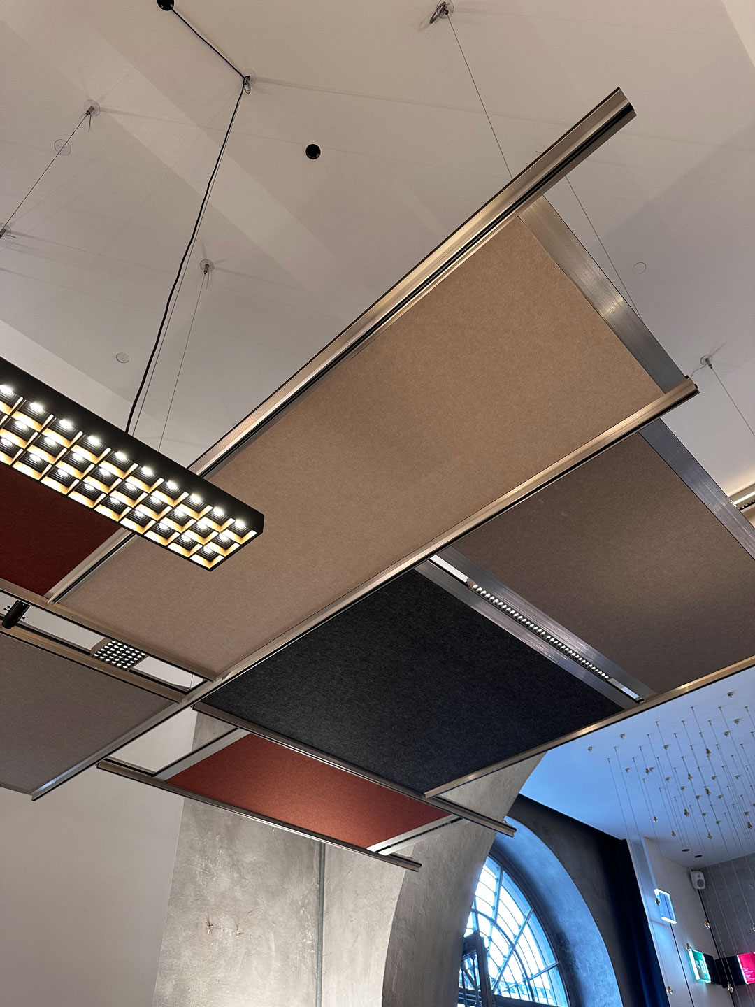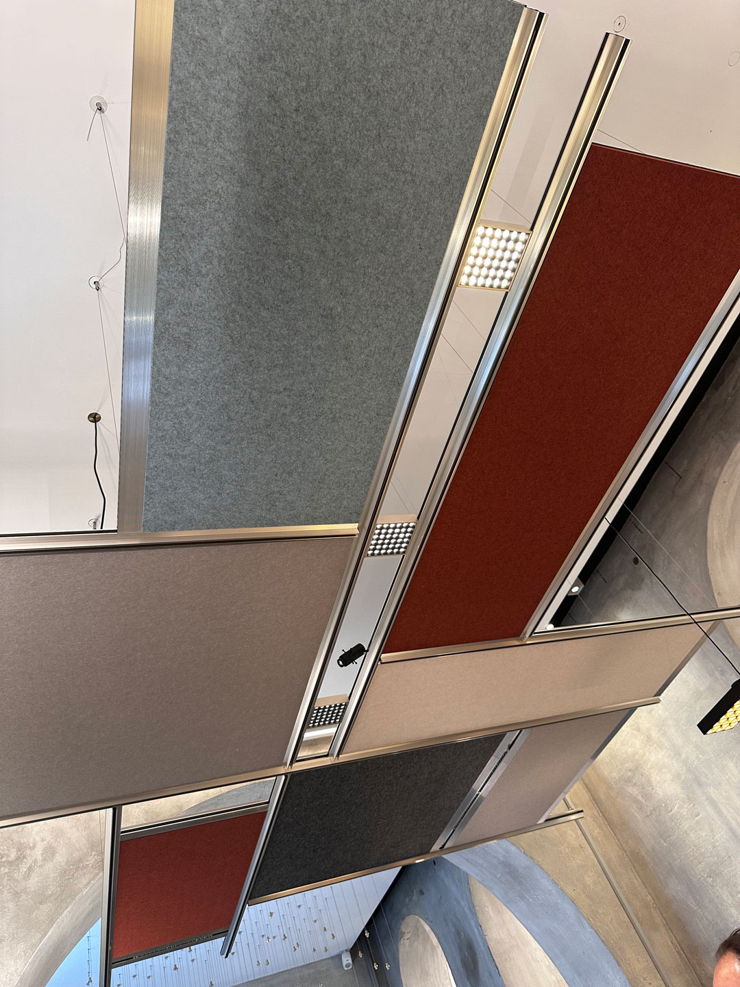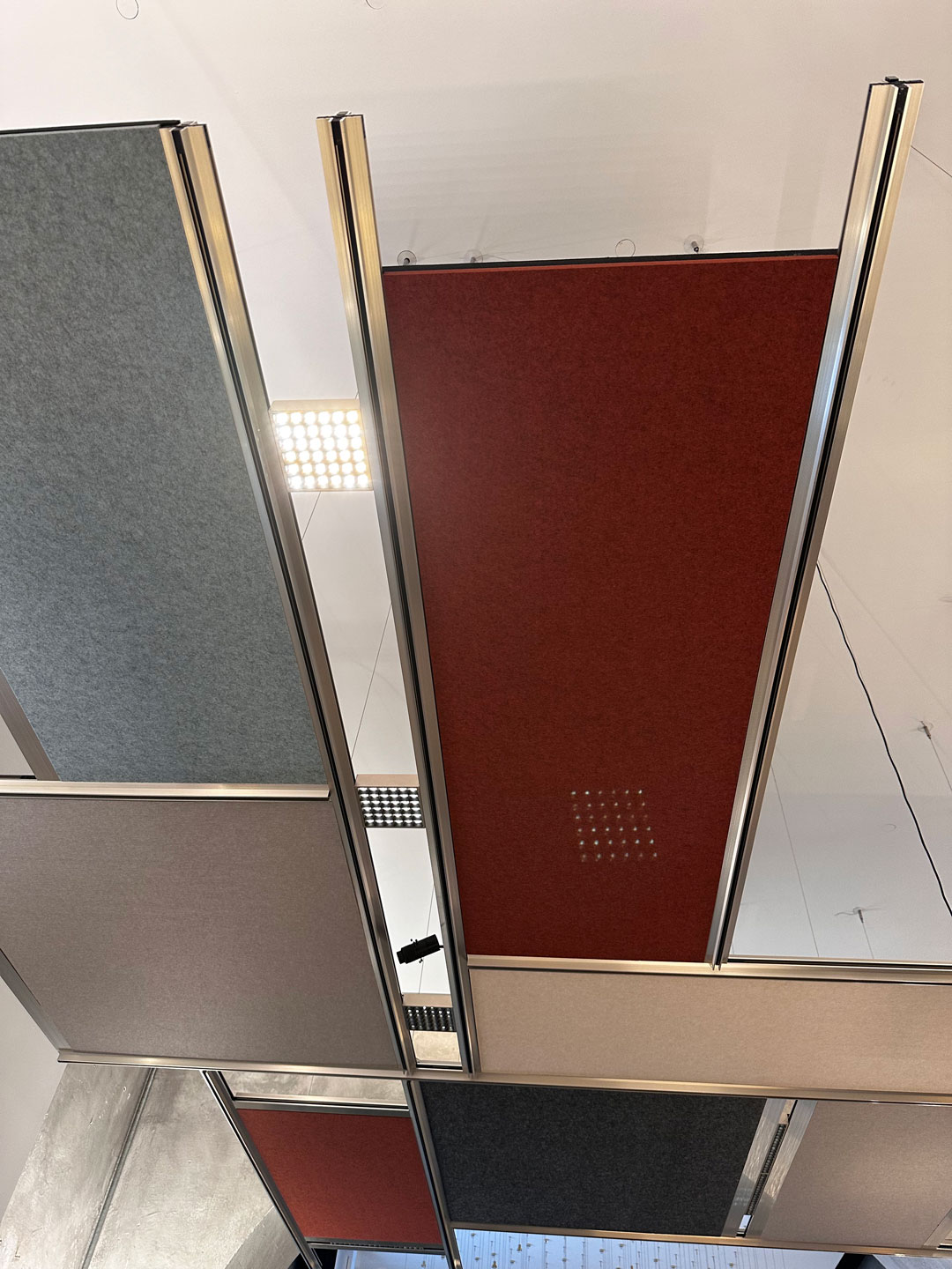 - Los paneles se aplican mediante una amplia gama de anclajes según las necesidades: en pared con muelles para atornillar en el panel, en techo pueden suspenderse mediante tirantes de acero (suspension kit) u otros sistemas de fijación a medida.