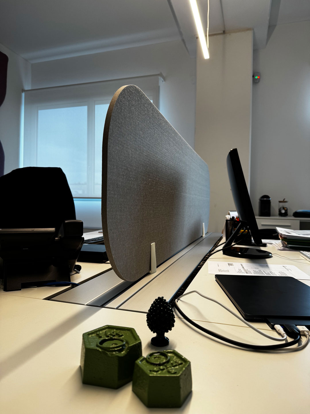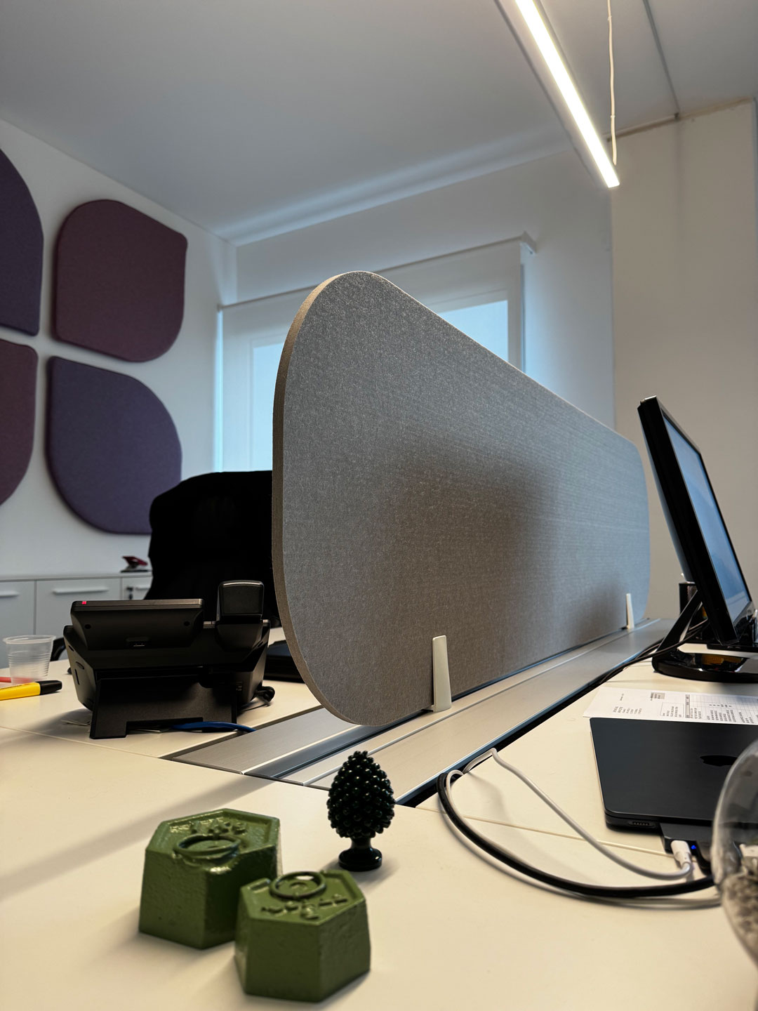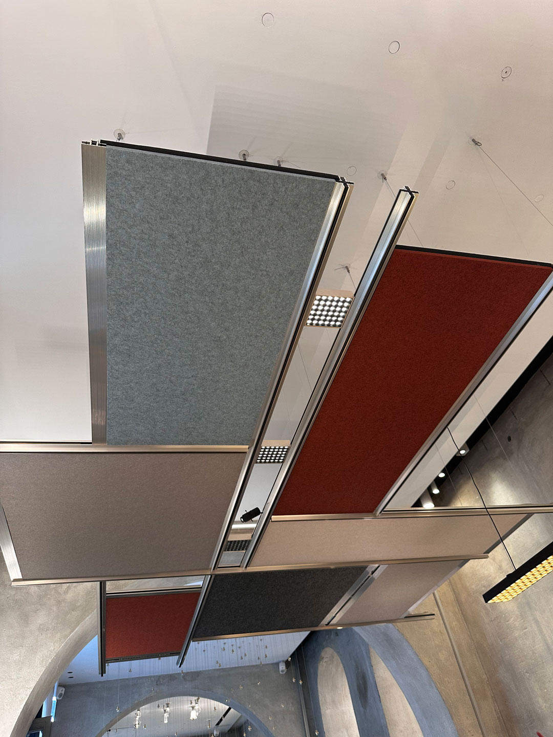 - Paneles fonoabsorbentes compuestos por fibra de poliéster de alta densidad, reciclados al 100%, con color a elegir del catálogo, resistentes a los impactos y a la humedad.